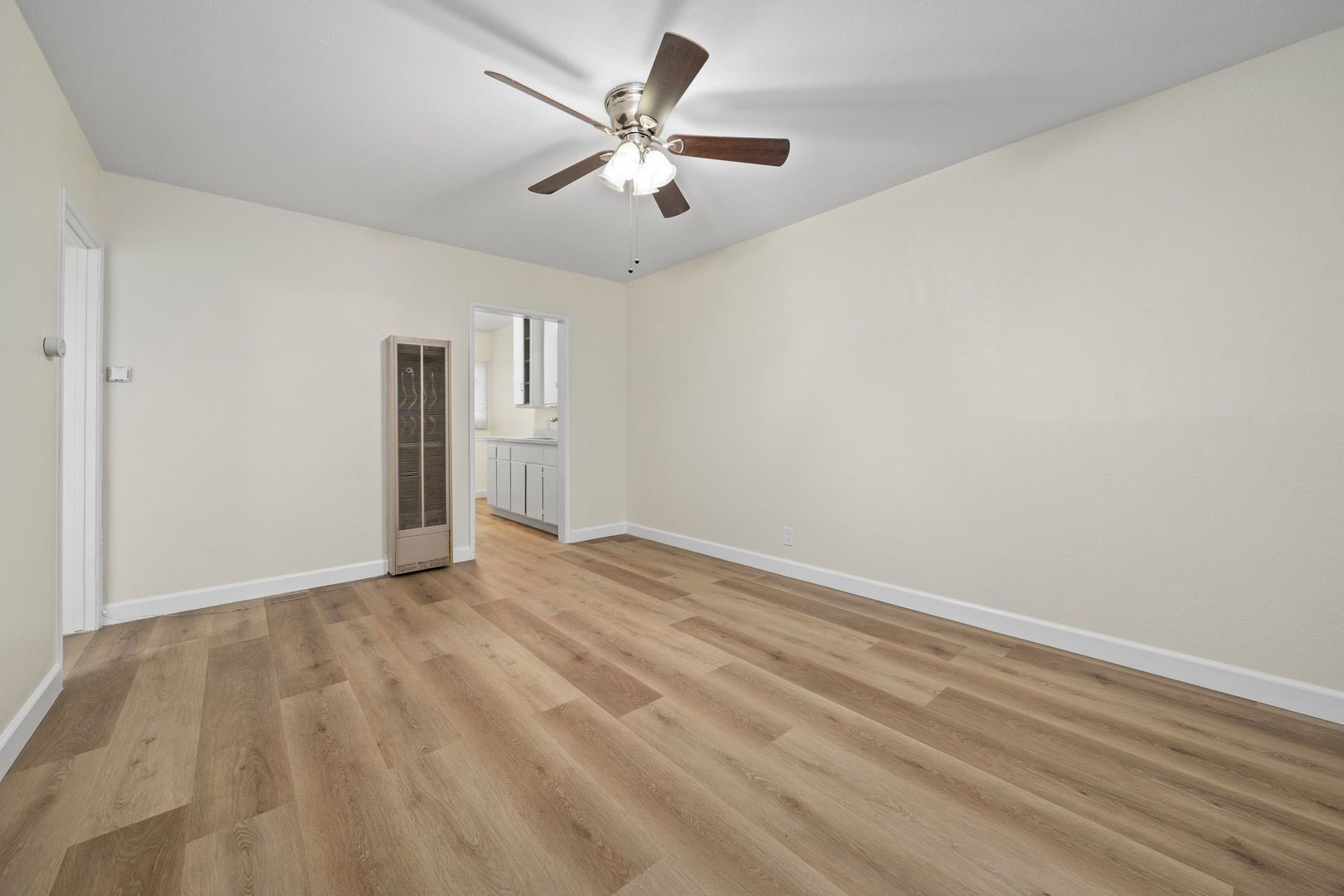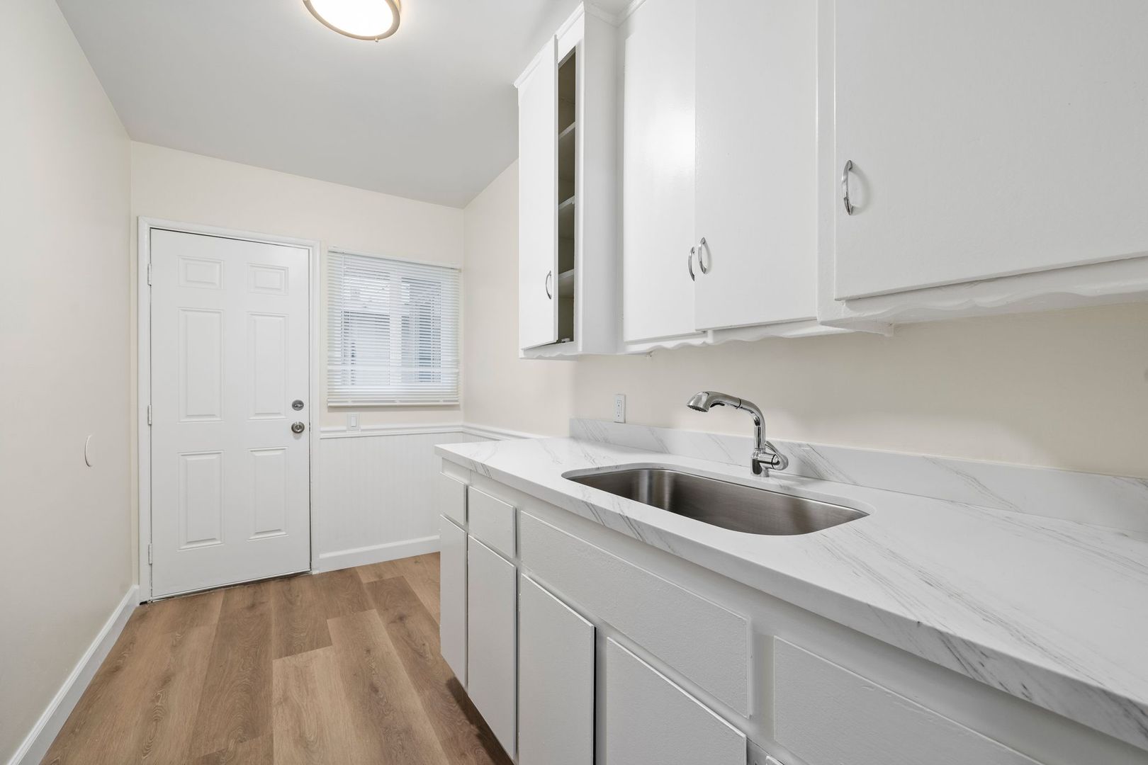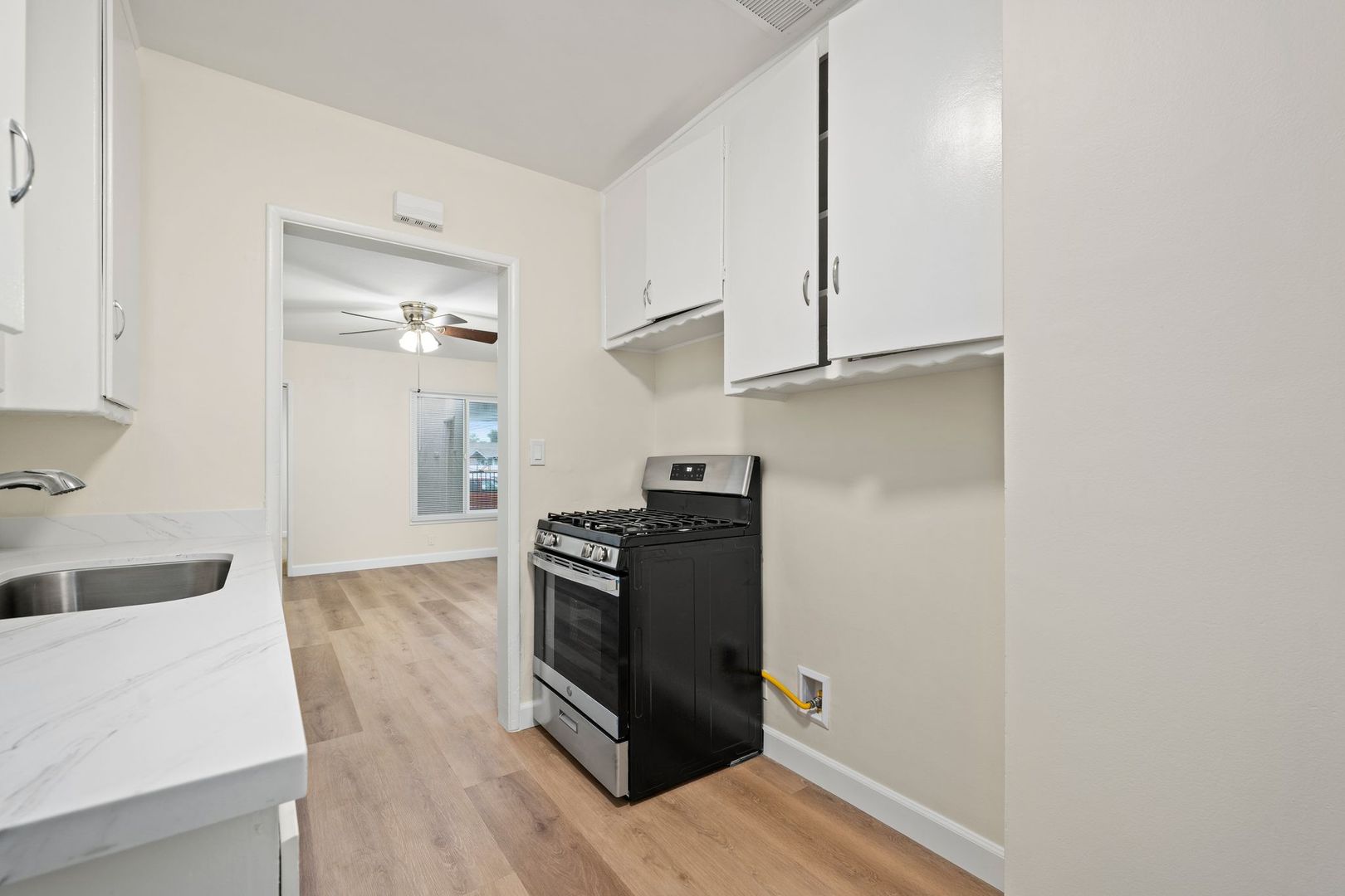 Step into this beautifully updated 2-bedroom, 1-bath apartment featuring fresh new carpet, modern paint, and an abundance of natural light throughout. The stylish kitchen boasts a brand-new gas stove, brand new quartz counters, lots of cabinet space and a eat in nook—perfect for everyday cooking or entertaining. Enjoy the spacious living room complete with new blinds, and windows throughout the unit. It's a welcoming atmosphere ideal for relaxing or hosting guests. The updated bathroom includes brand-new flooring and a sleek vanity for a clean, modern look. Additional conveniences include a one-car garage and access to shared laundry facilities within the building.