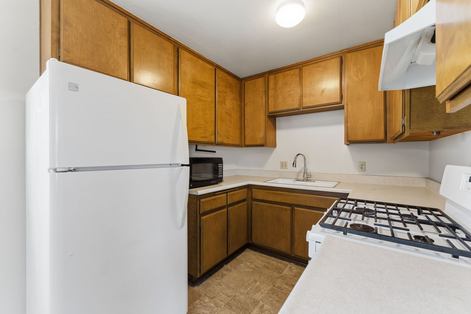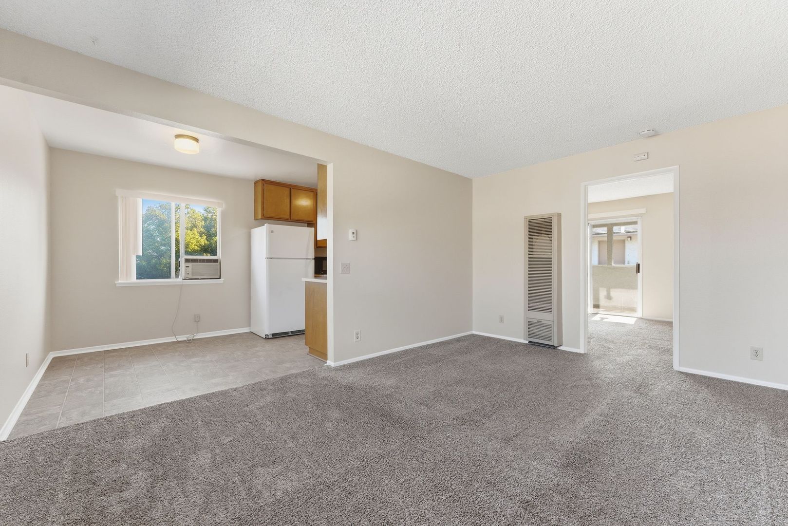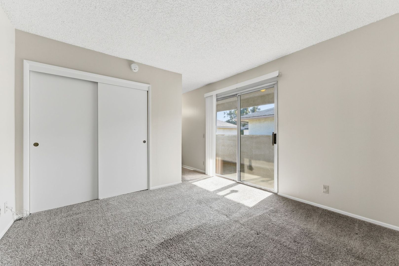 Step into this charming one-bedroom, one-bath apartment located on the second floor with a private entrance. Offering approximately 650 square feet of bright, airy living space, this home features soft carpeting throughout the living area and bedroom. The kitchen flows seamlessly into the dining area and is equipped with a newer gas range, a convenient countertop microwave, and a window AC unit to keep things cool. The bedroom includes an en suite bathroom and opens onto a spacious private balcony—perfect for relaxing or enjoying your morning coffee. Conveniently located near the 5 freeway, restaurants, and grocery stores. Water and trash are included. Available with a 12-month lease and one-month security deposit.